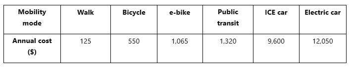 Despite the big differences in income and costs across countries, there is a strong correlation in the percentage of household income spent on transportation which typically range between 13% and 16%, although our own studies show it can reach 30%+ outside urban areas and in lower income groups. There are very few recent comparative studies of the cost of transportation across different modes but a European Environment Agency study in 2016 covering UK, Denmark and Finland showed that over a 20-year period the cost of car ownership had remained stable in both UK and Denmark whilst bus and rail fares had increased more rapidly ~ 30% in the UK and more than 50% in Denmark. Whilst a full set of data is not available EU-wide it is considered representative of the EU as a whole. The outlier is Finland where the cost of car ownership increased substantially, but in line with bus and rail fares. Data from Australia (see table) shows the relative cost of a subset of mobility modes. Relative costs particularly of EV are changing rapidly and may not be current at the time of writing. Also, the costs will vary from country to country.