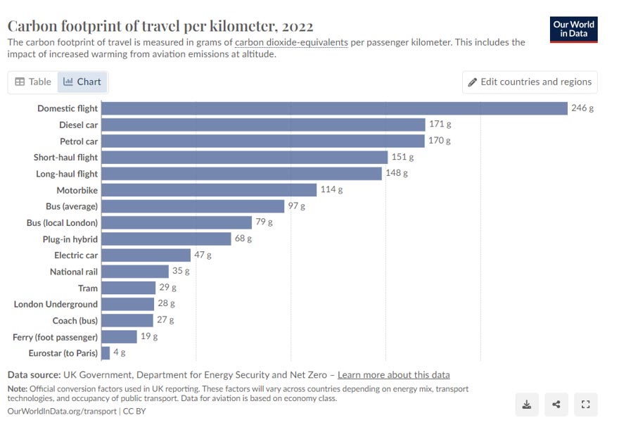 A 2022 study of carbon footprint from different mobility modes by the UK Government, Department for Energy Security and Net Zero, reported that National rail emits approximately 35 grams of CO2 per km and petrol, or diesel fuelled cars emit approximately 170 grams per km.