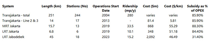 Indonesia has been investing heavily in mass PT for more than two decades (see table). Jakarta has pioneered the relatively low cost Transjakarta BRT system first opened in 2004. It is now the largest BRT system in the world, carrying more than 1 million passengers per day and is supported by a feeder system of local buses. More recently Jakarta has developed the first phases of MRT Jakarta, LRT Jabodebek and LRT Jakarta with plans for further extensions over the coming years. Other cities are building PT networks with an emphasis on less expensive BRT systems.